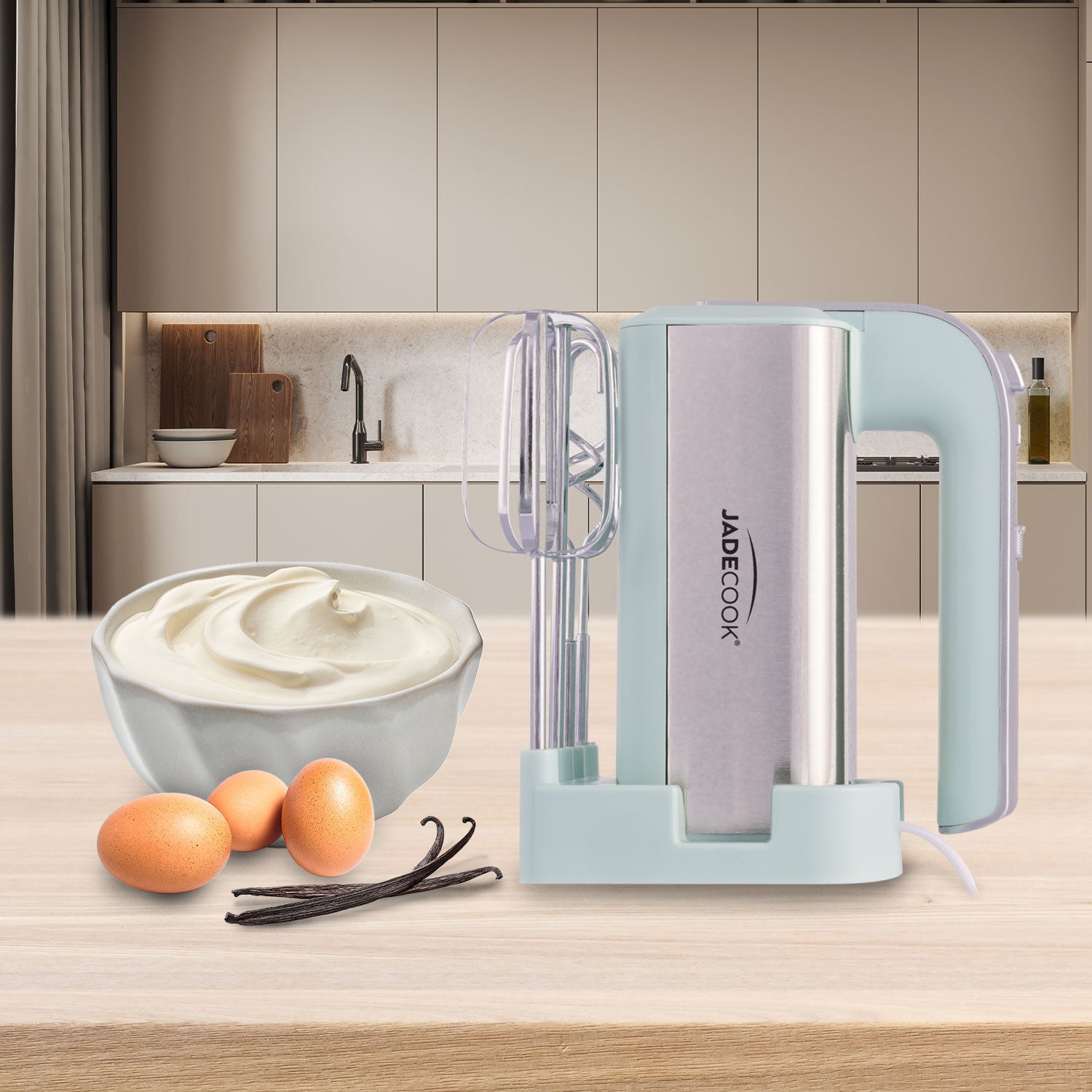 Con la Batidora Manual Jade Cook, las posibilidades en la cocina son infinitas. ¿Te gustaría preparar un delicioso pastel esponjoso? Su batidor de globo hará que las claras se monten a la perfección. ¿Te encantan las pizzas caseras? Usa el gancho para amasar y consigue una masa suave y lista para hornear.