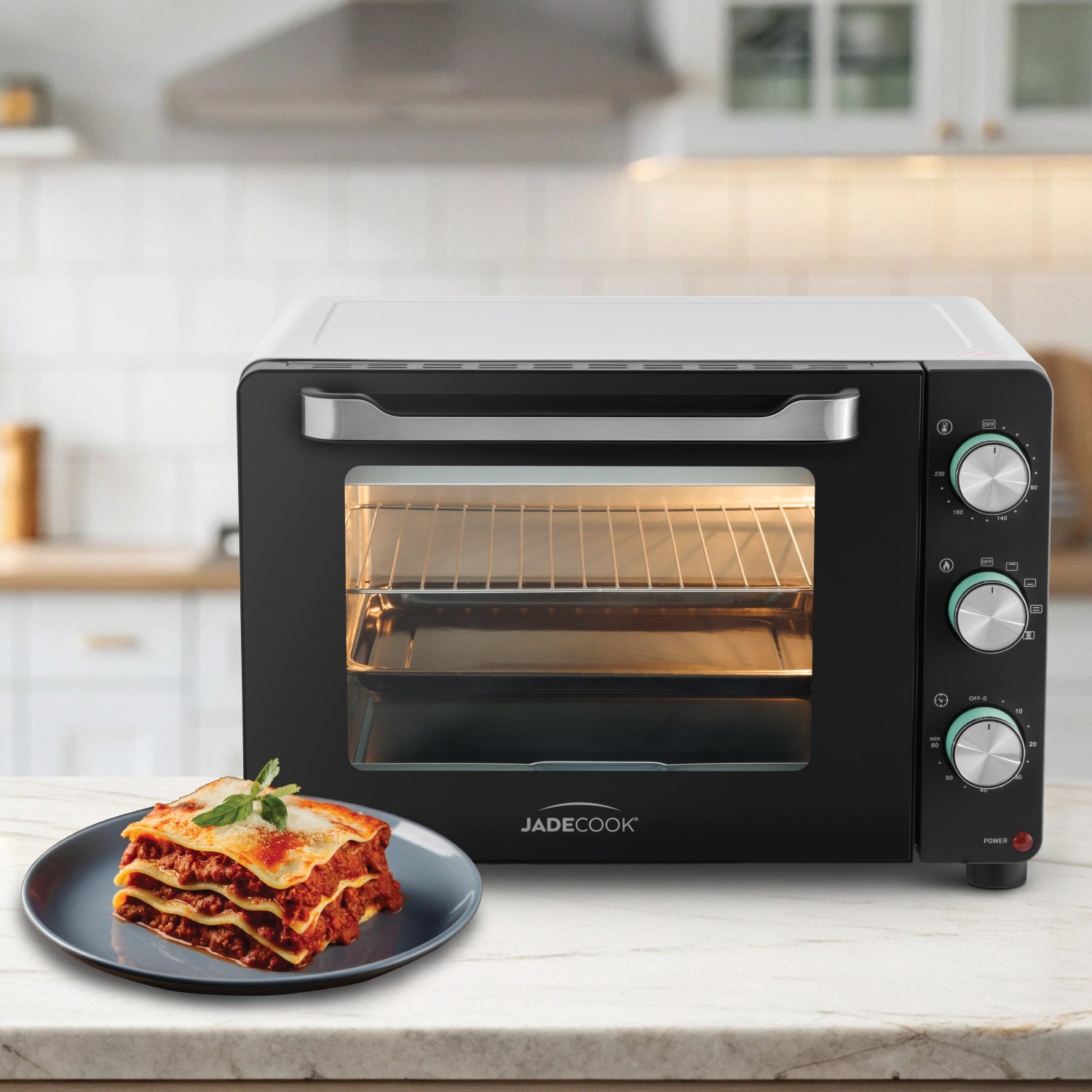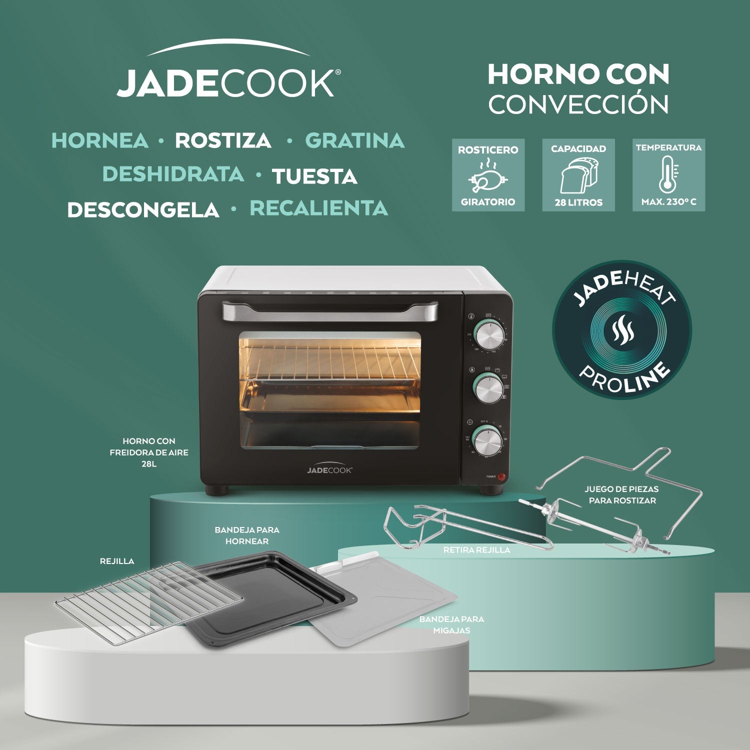 Con tecnología de convección JadeHeat ProLine, este horno no solo hornea, también rostiza, gratina, deshidrata, tuesta, descongela y recalienta, todo con una eficiencia y practicidad que te hará olvidarte del horno tradicional.