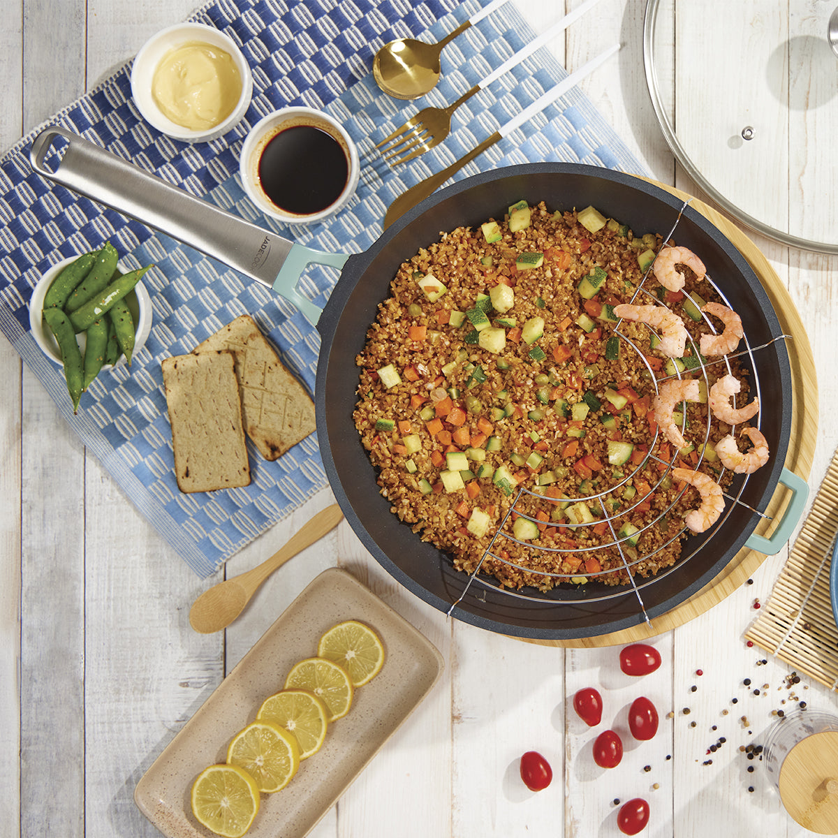 ¡Desata tu creatividad culinaria con este sartén wok Jade Cook Pro Series de 30 cm! Su amplia superficie te permiten preparar una gran variedad de platillos, desde salteados asiáticos hasta sofritos tradicionales.